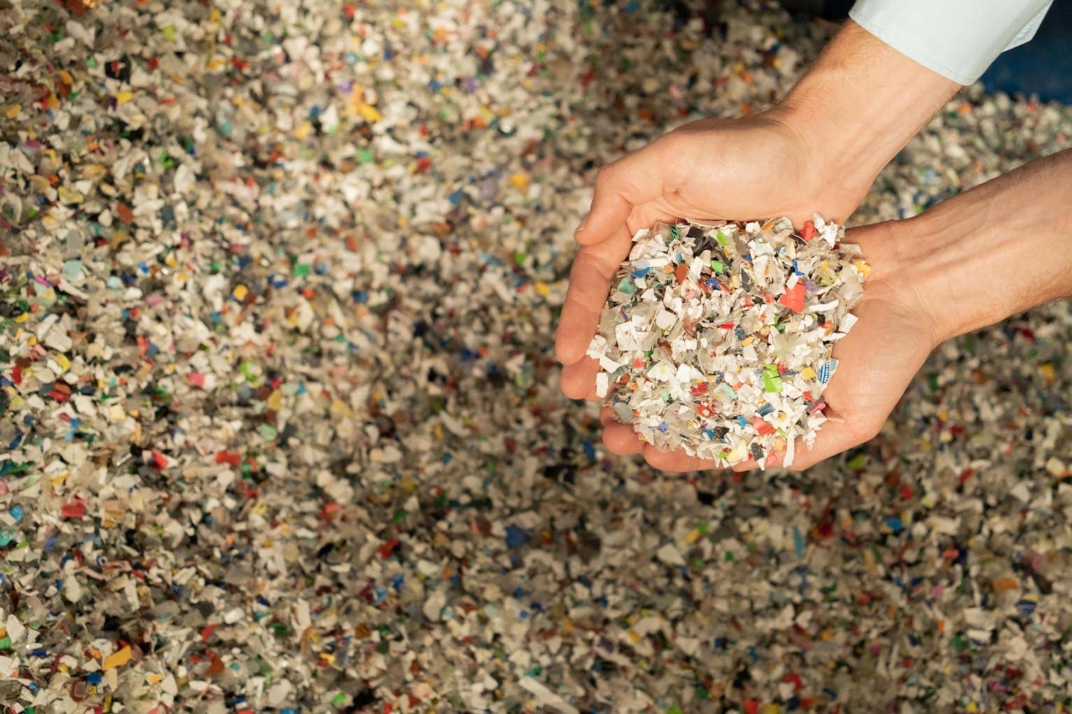 Mitarbeiter mit bunten Rezyklaten in der Hand